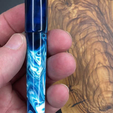 Ocean blue and white. Pen will come with a Jowo 6 steel nib, converter and custom Rick Shaw pen sleeve. Arctic Blast$190.00PriceNib Selection*SelectQuantity*Add to Cart